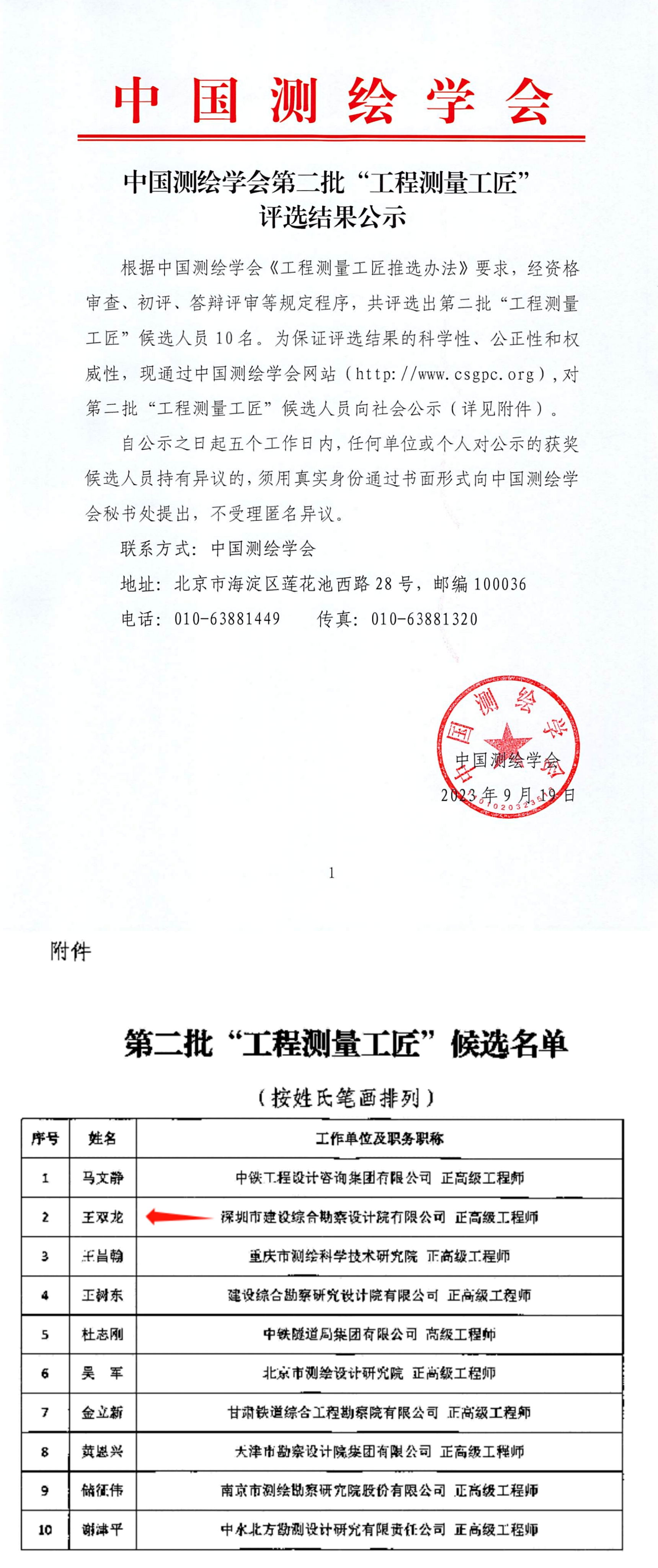 本次评选经资格审查、初评、答辩评审等多个程序环节,共评选出第二批“工程测量工匠”候选人员10名,我司总经理王双龙脱颖而出,榜上有名。