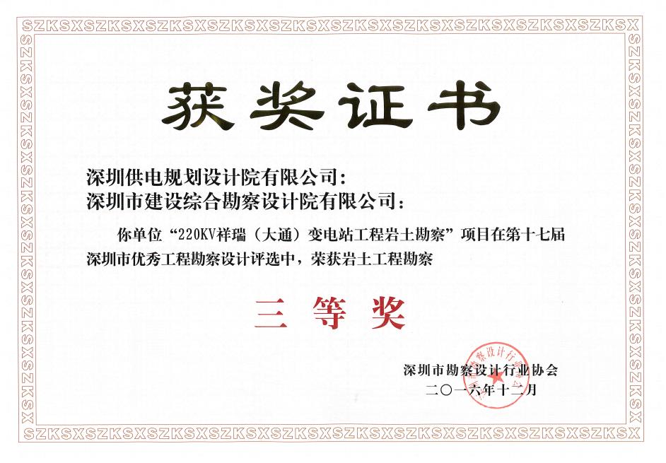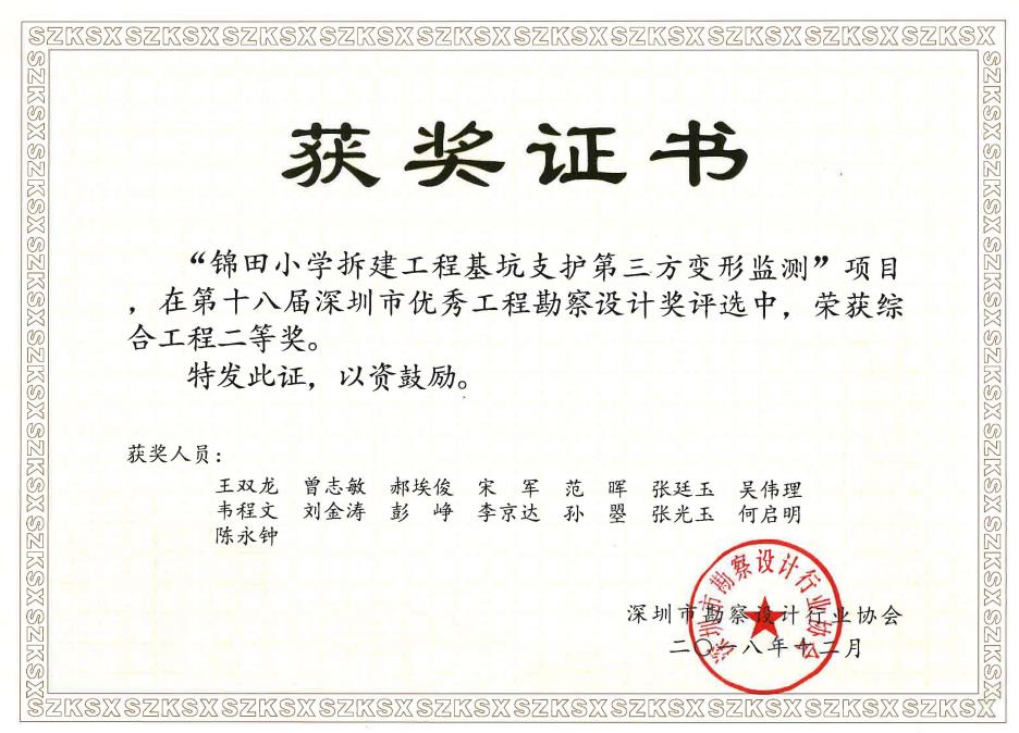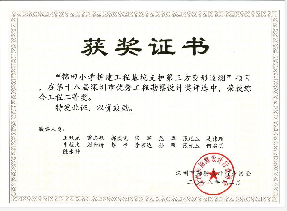 2018.12“锦田小学拆建工程基坑支护第三方变形监测”项目-第十八届深圳市优秀工程勘察设计奖评选获-综合工程二等奖2018.12“锦田小学拆建工程基坑支护第三方变形监测”项目-第十八届深圳市优秀工程