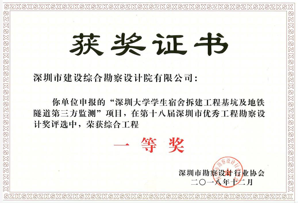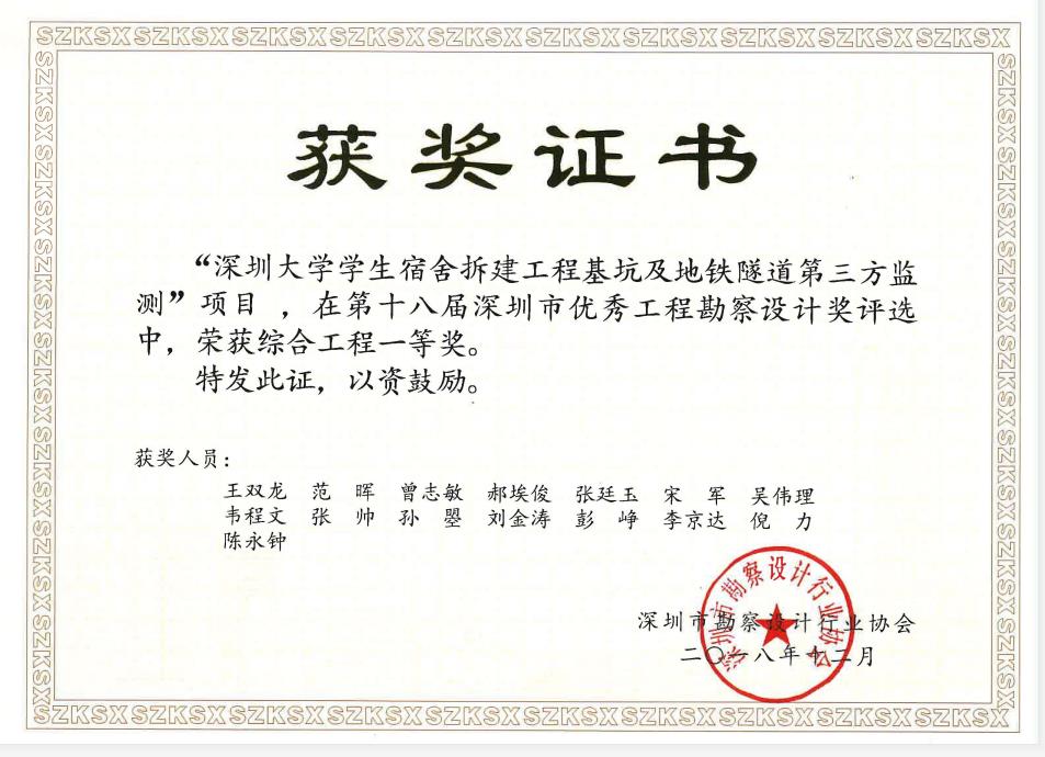 2018.12“深圳大学学生宿舍拆建工程基坑及地铁隧道第三方监测”项目-第十八届深圳市优秀工程勘察设计奖-综合工程一等奖