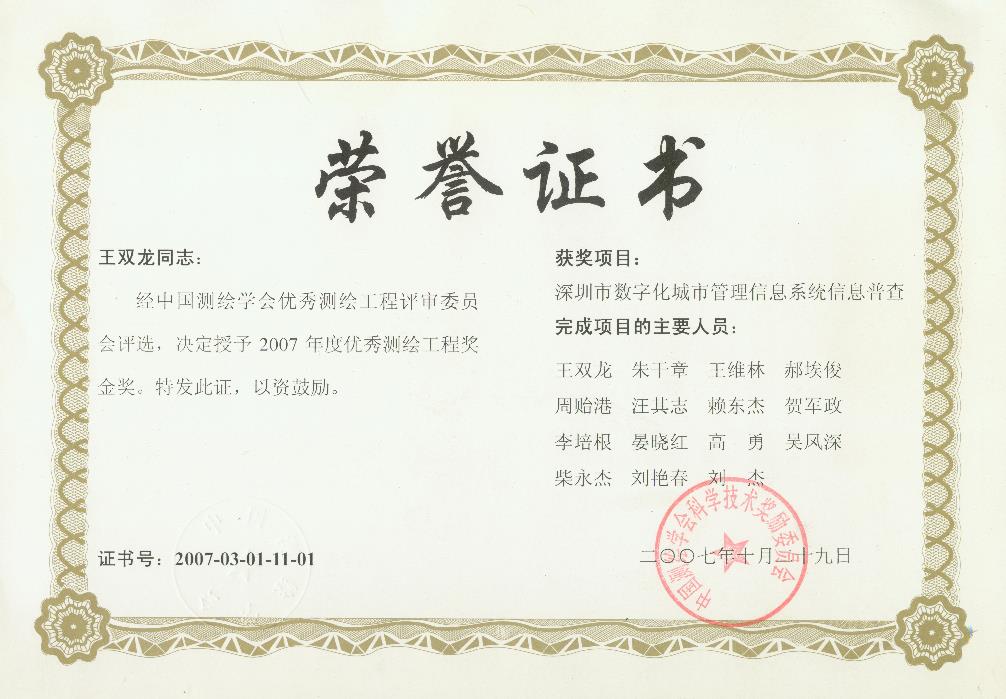 深圳市数字城市管理信息系统信息普查工程---中国测绘学会金奖